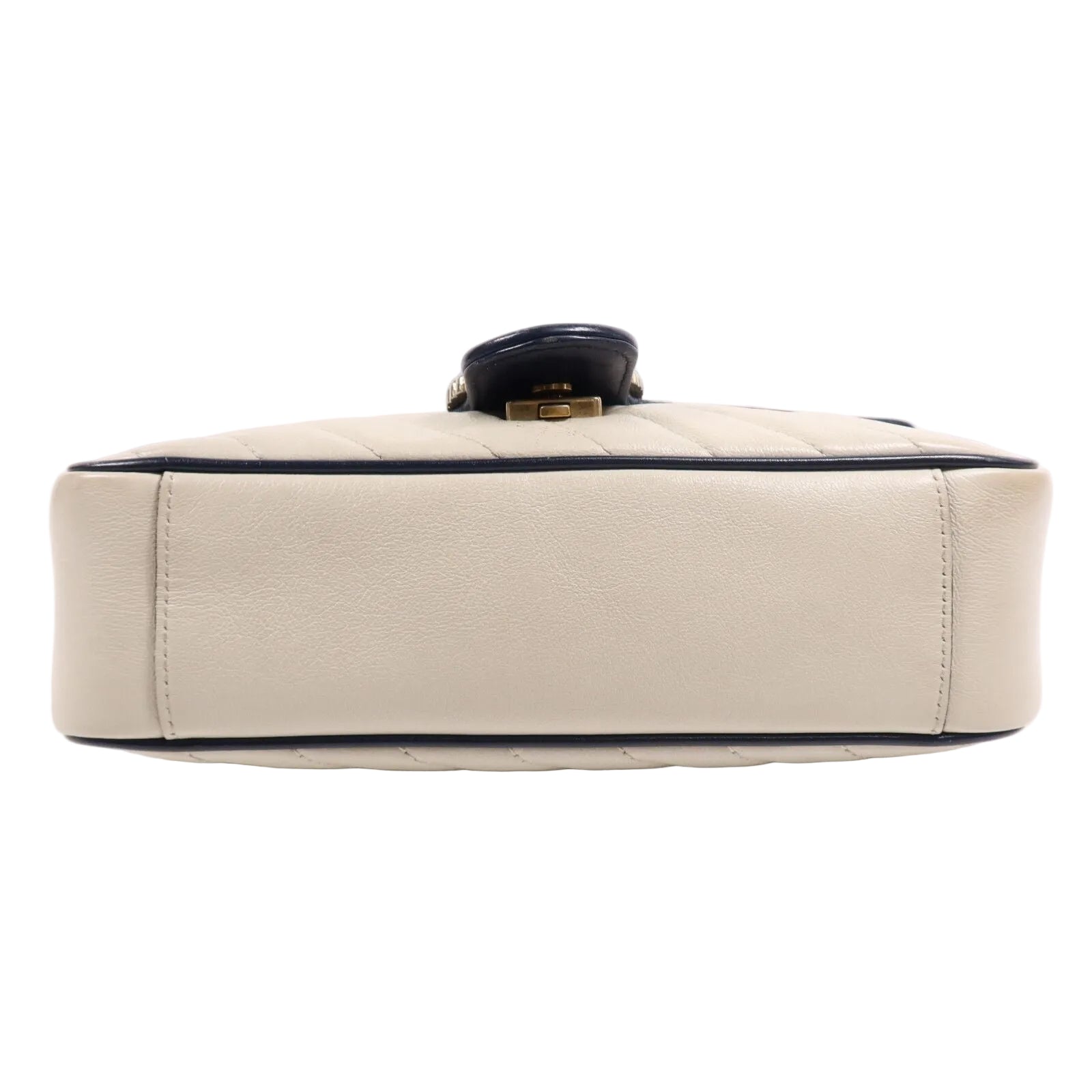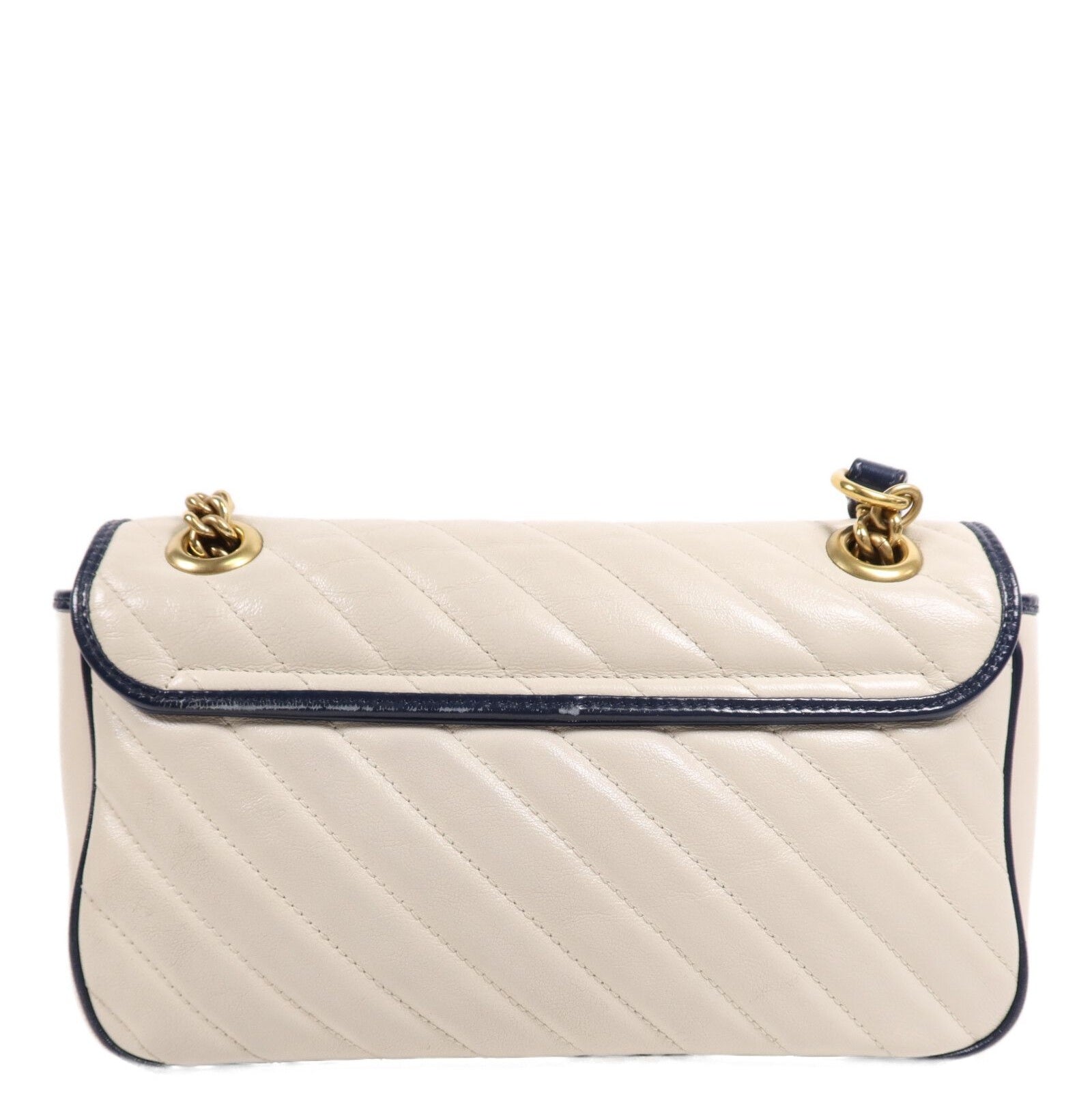 Pre-Loved Gucci GG Marmont Diagonal Flap Bag in creme & navy quilted leather, gold-toned hardware, single shoulder strap, suede lining, dual interior pocket, push lock closure at front. |