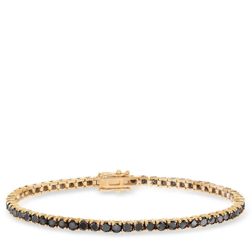 Ladies 14 karat yellow gold natural black diamond tennis bracelet featuring 7 carats round black diamonds, push clasp with dual safety.