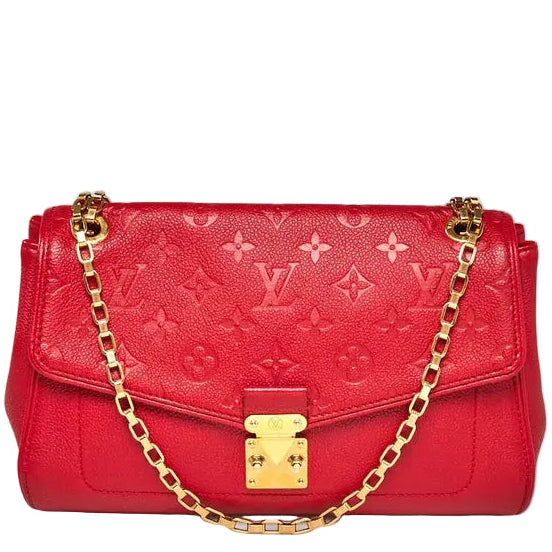 Pre-Loved Louis Vuitton Saint Germain PM in red empreinte leather, brass hardware, chain strap, suede lining, interior zip pockets, push-lock clasp.