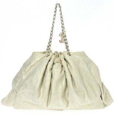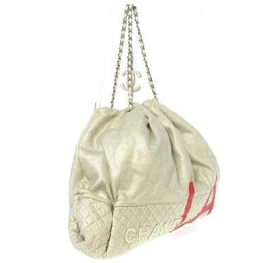 Pre-Loved Chanel LA Cabas XL tote in metallic gold creme quilted jersey knit with silver-tone hardware, dual chain-link and jersey shoulder straps, creme and red leather logo patch accents at front face, gold lining, single pocket at interior wall with zip closure and zip closure at top featuring CC logo zipper pull. |