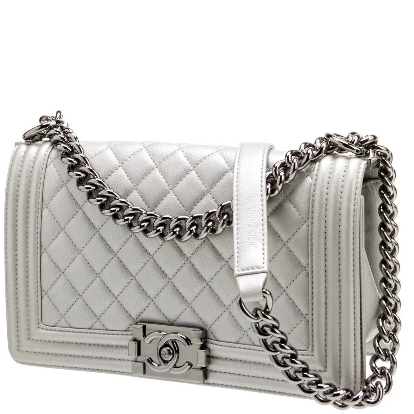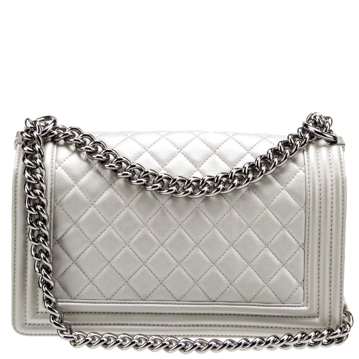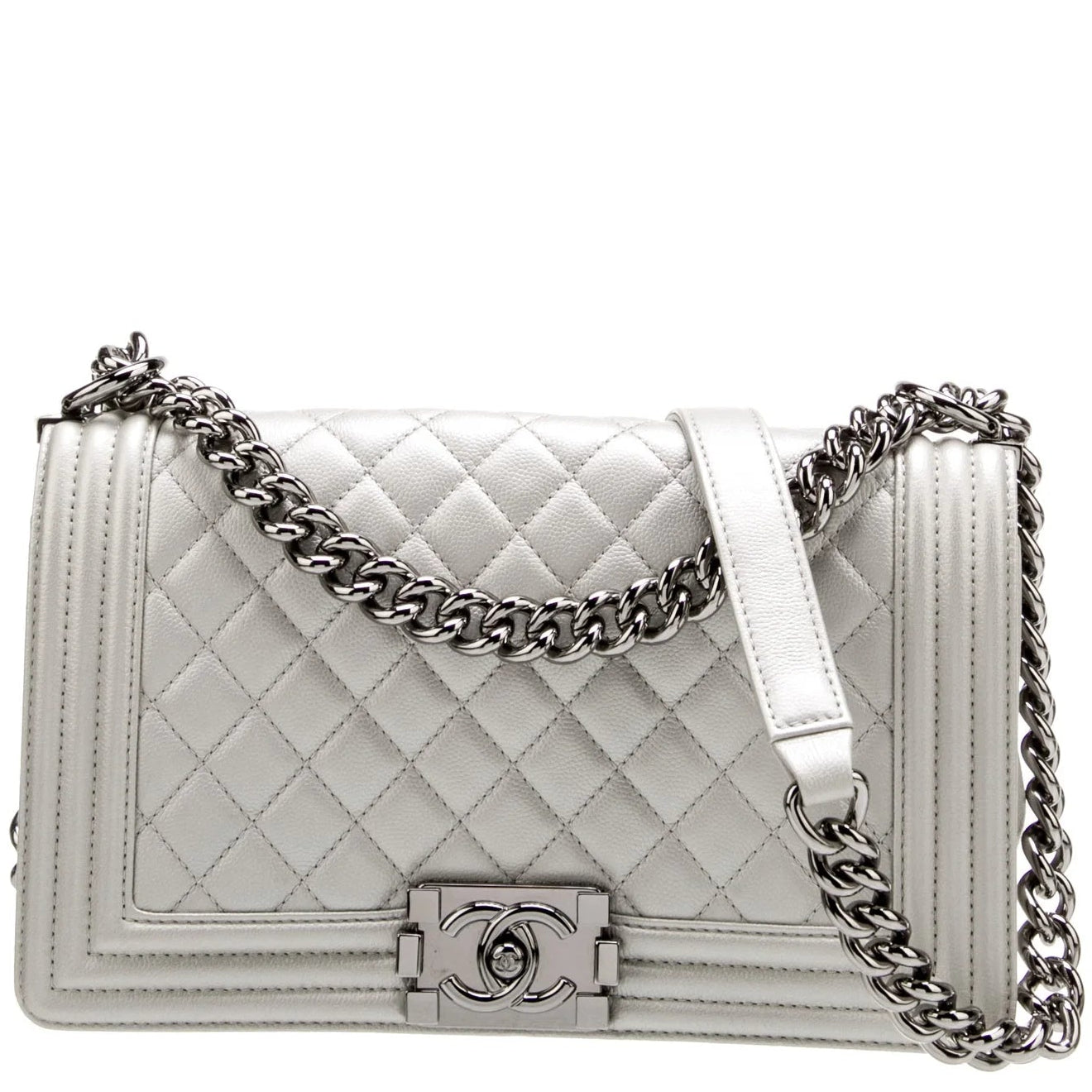 Pre-Loved Chanel Medium Boy Bag circa 2018 in silver quilted caviar leather, interlocking CC logo, silver-tone hardware, leather trim, chain link shoulder strap, leather lining, single interior pocket, push lock closure at front. Includes card & dustbag |