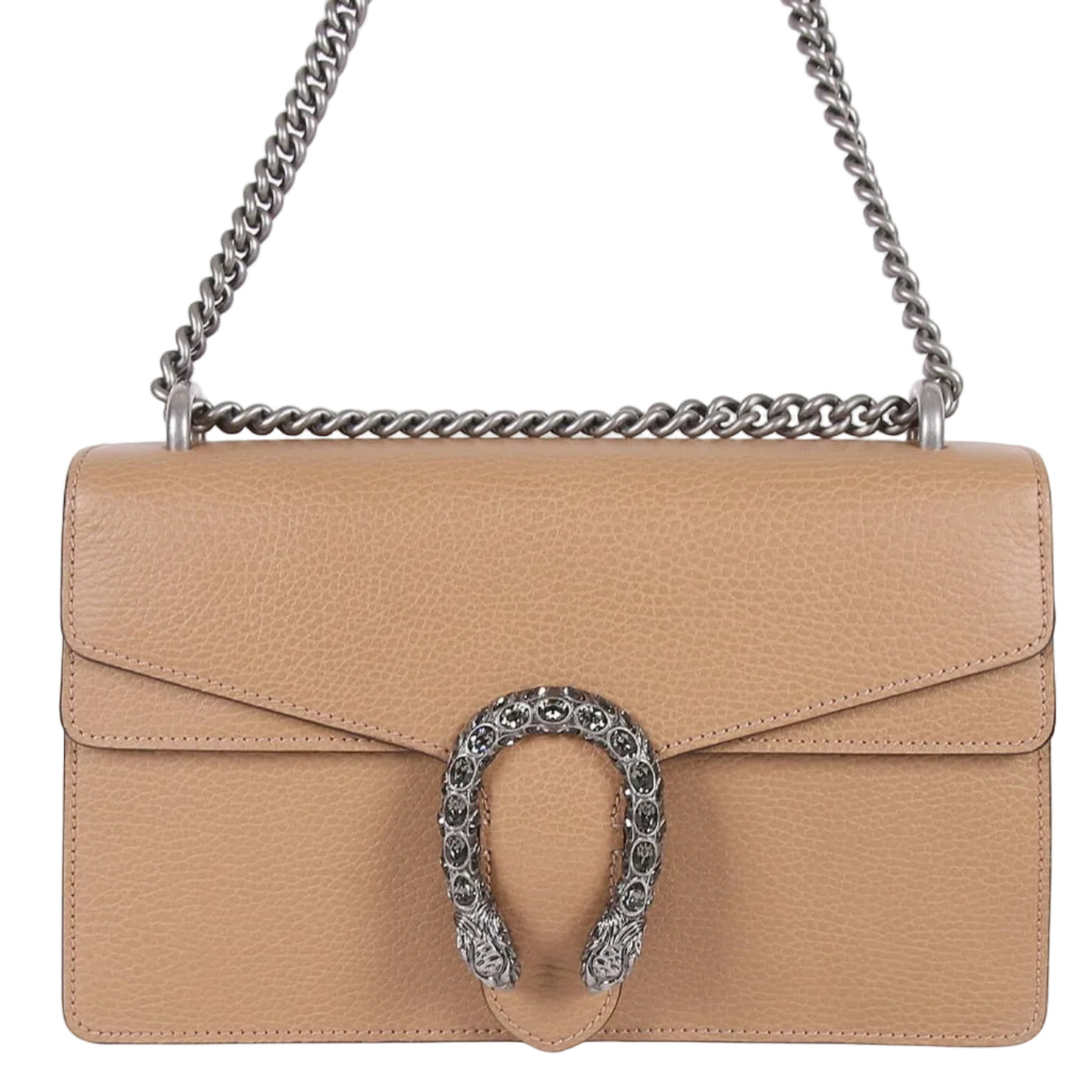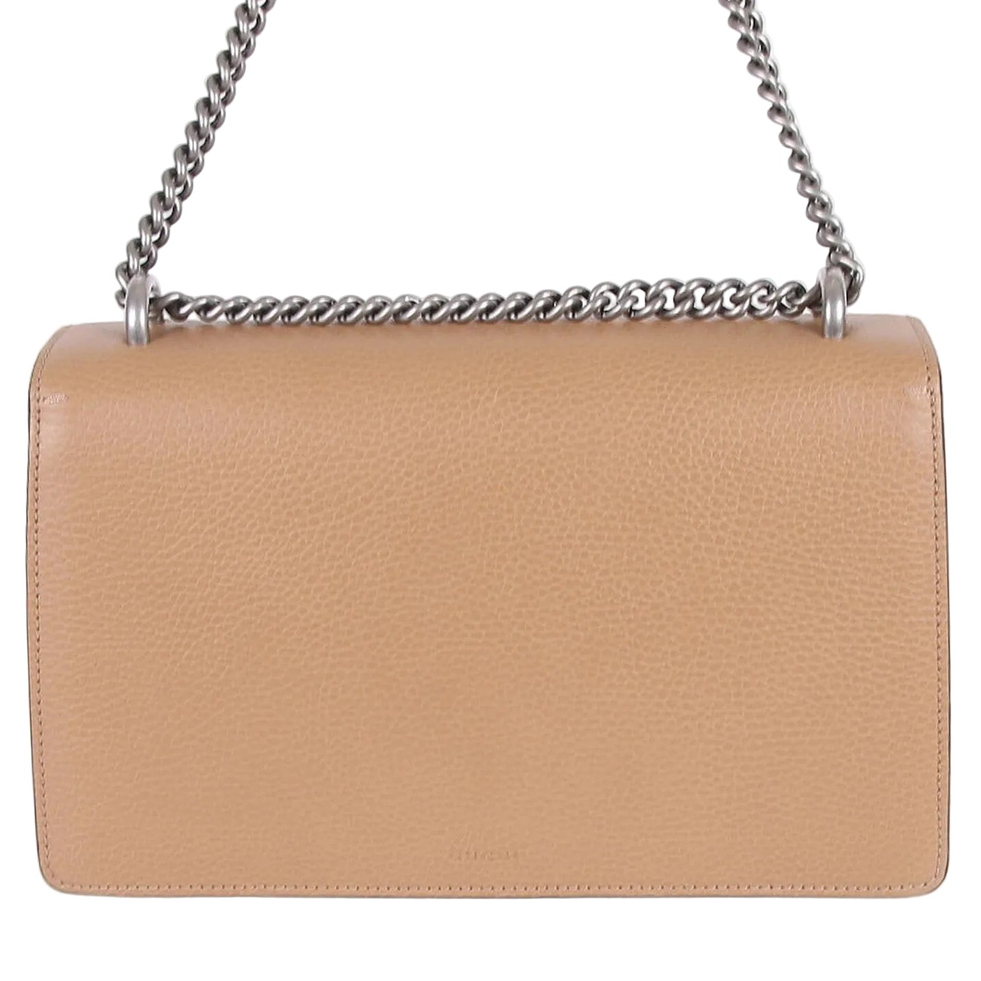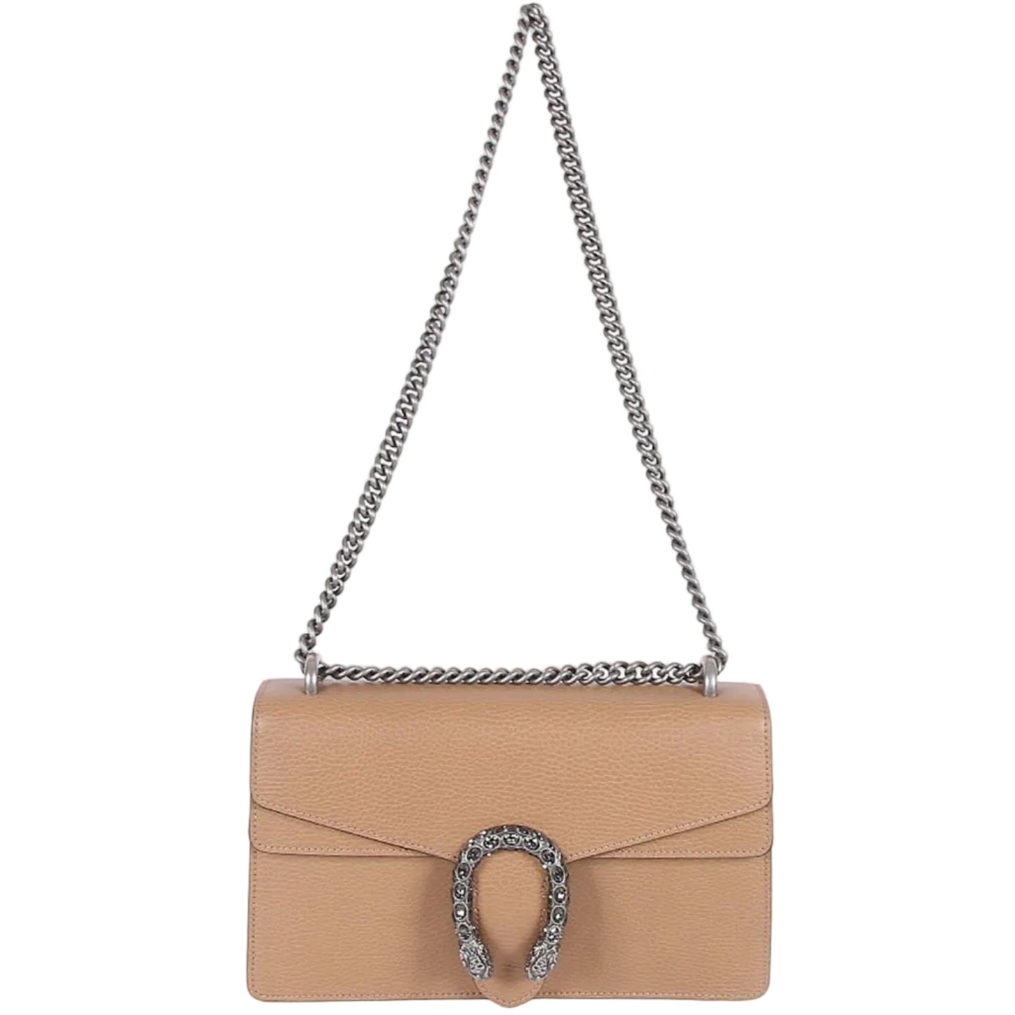 Pre-Loved Gucci embellished Dionysus shoulder bag in camel leather, crystal Dionysus accent, antiqued silver-tone hardware, chain link shoulder strap, canvas lining, 2 compartments, single zip interior pocket, push lock closure at front.