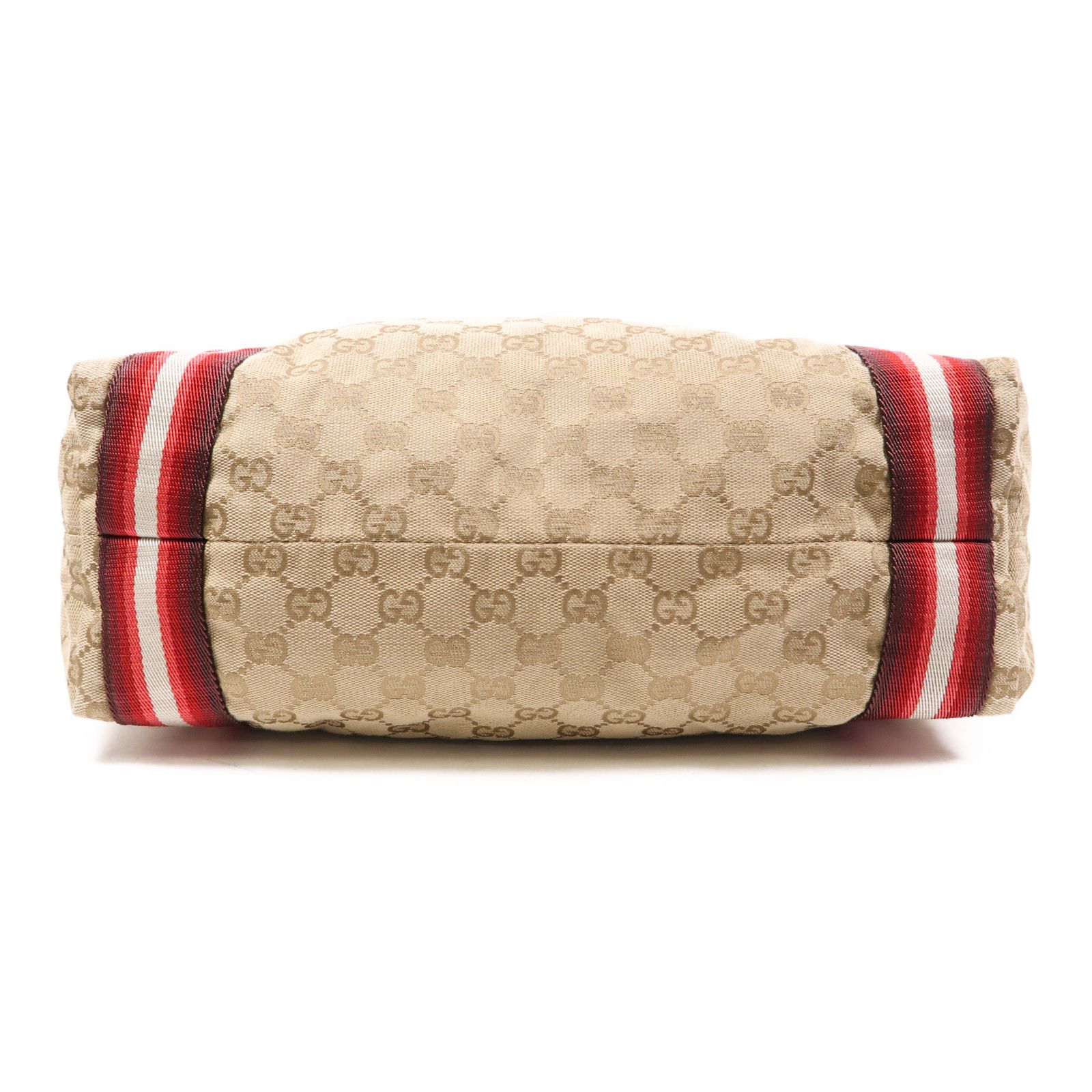 Pre-Loved Gucci Medium Web Tote in GG Canvas, red sherry line accent, leather trim, dual shoulder straps, flat handles, canvas lining, interior pockets, open top. |