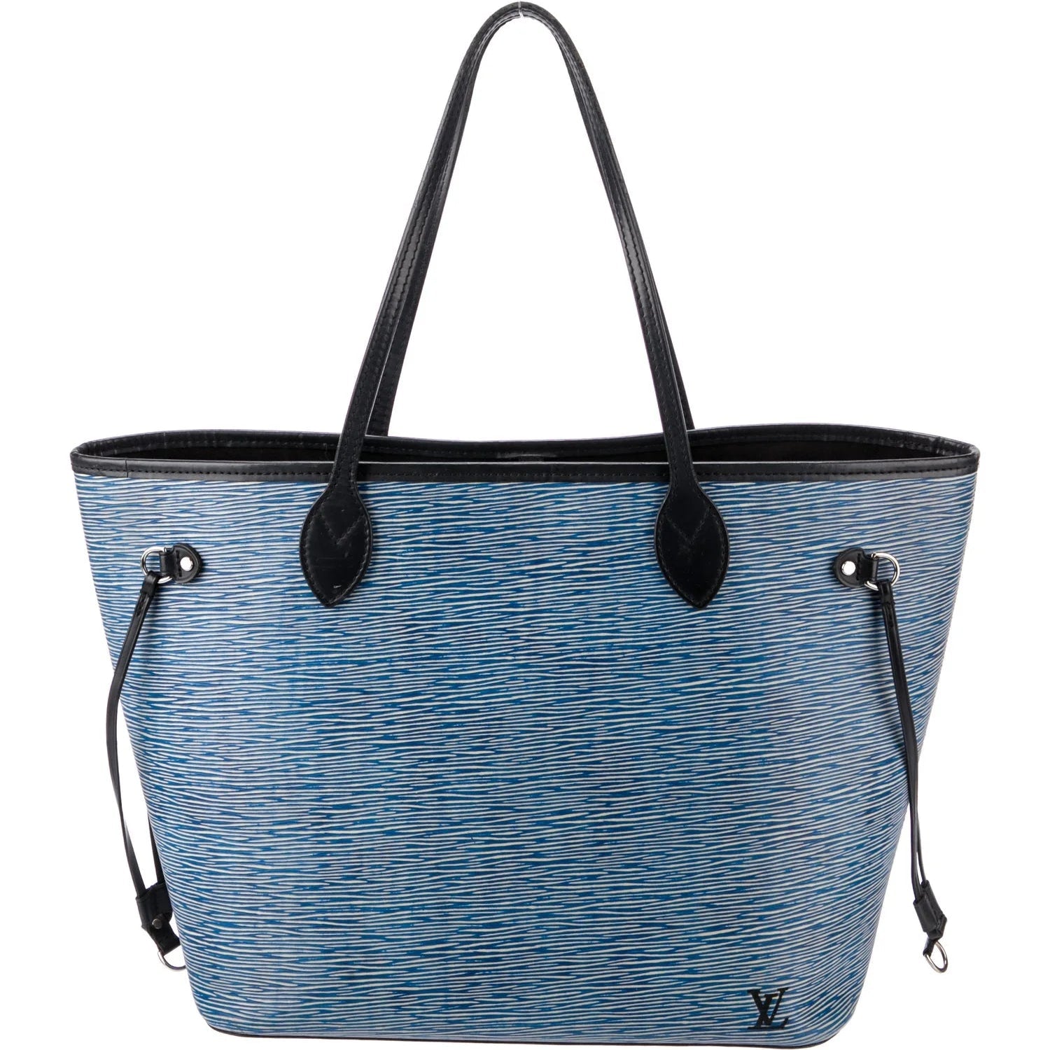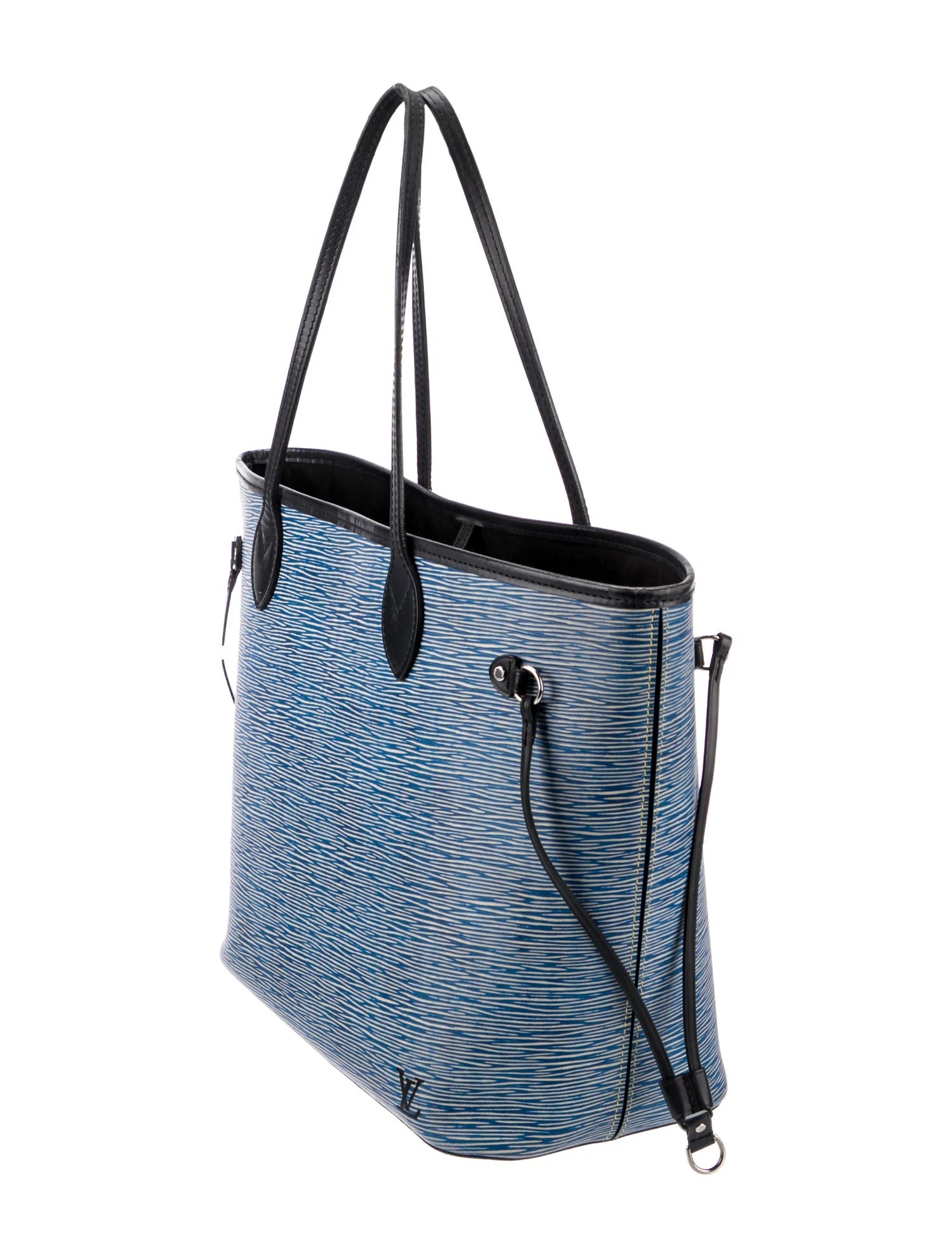 Pre-Loved Louis Vuitton Neverfull MM in blue epi leather, silver-toned hardware, leather trim, dual shoulder strap, leather trim, alcantara lining. Includes Pouch |