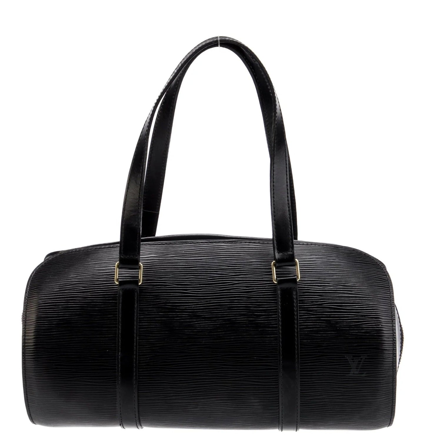 Pre-Loved Louis Vuitton Soufflot bag in black Epi leather with brass hardware, dual flat shoulder straps, embossed logo at front corner, Alcantara lining, single slit pocket at interior wall and zip closure at top. |