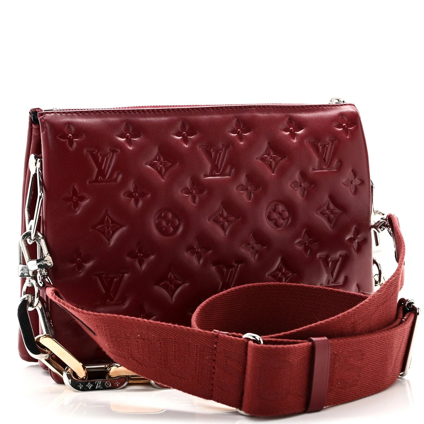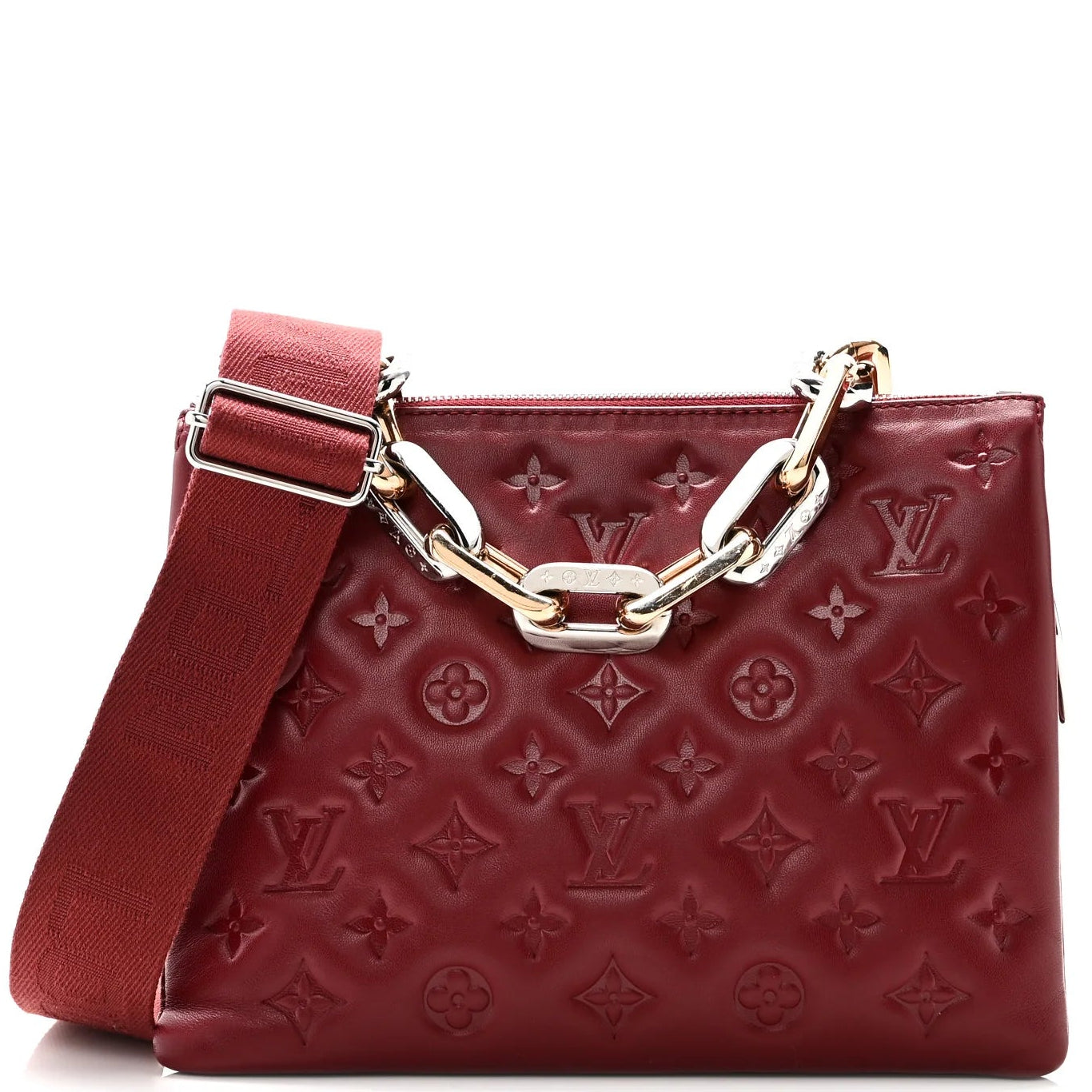 Pre-Loved Louis Vuitton Monogram Coussin PM in wine red embossed leather, tu-tone white/rose hardware, chain-link handle, single adjustable strap, alcantara lining, 3 interior compartments, zip closure at top. |